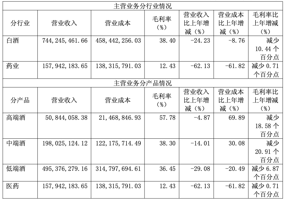 其中,分行业来看,白酒和药业营业收入分别下降24.23%、62.13%,毛利率分别减少10.44%、0.71%。