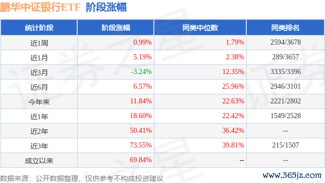 从业绩表现来看,鹏华中证银行ETF基金过去一年净值涨幅为27.39%,在同类基金中排名399/2216,同类基金过去一年净值涨幅中位数为11.09%。而基金过去一年的最大回撤为-10.66%,成立以来的最大回撤为-24.04%。